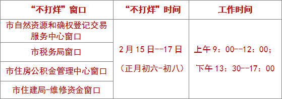1.窗口服务(窗口端)。2月15日~17日,市自然资源和确权登记交易服务中心、市税务局、市住房公积金管理中心、市住建局维修资金4个进驻窗口部门提供“不动产(转移、抵押)登记、不动产契税缴纳、公积金贷款、维修资金缴存”等业务现场办理服务。