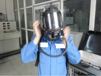 外部监护人迅速将外部准备好的防护设施穿戴整齐先行实施救援。若施工人员仍有意识,监护人员可在外部直接传递通气式呼吸器面罩,使其自救;若施工人员已失去意识,监护人戴面罩进入作业空间救援。