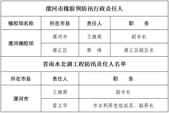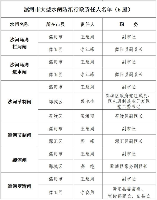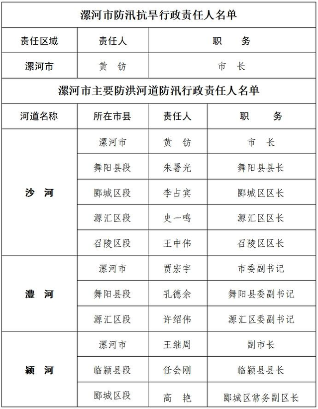 漯河市防汛抗旱和主要防洪河道防汛行政责任人名单