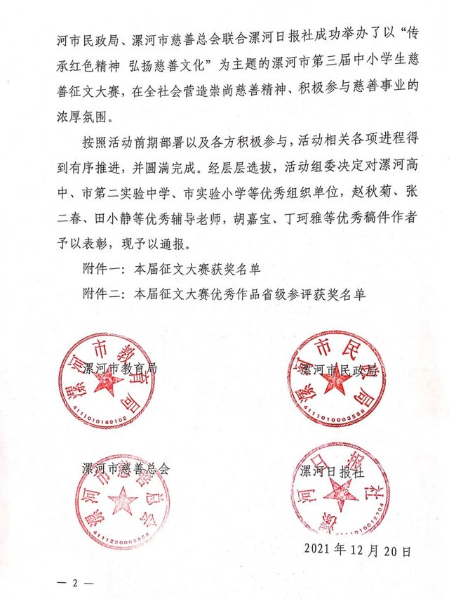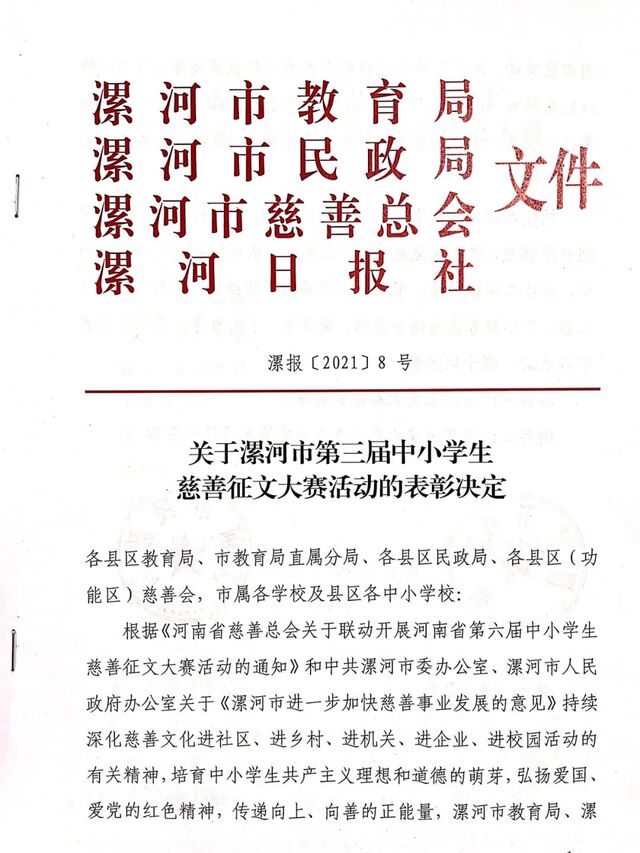 此次征文大赛由市慈善总会、市教育局、市民政局联合漯河日报社共同举办。大赛联动省慈善征文活动一并进行。征文期间,同学们踊跃投稿,共收到作品8000余篇。孩子们的作品形式多样,内容丰富,主题鲜明,或穿越时空隧道看党史、学党史,或致敬革命前辈的英勇壮举和革命精神,或抒发为振兴中华而努力读书的豪情壮志,或记录身边的凡人善举,或分享身体力行参与慈善的心得体会,或赞颂河南出现洪灾后一方有难、八方支援的人间大爱……字里行间,充盈着对党和国家的深深热爱,彰显着“强国有我”的精神气概,更饱含着“上善若水”的无限情怀。