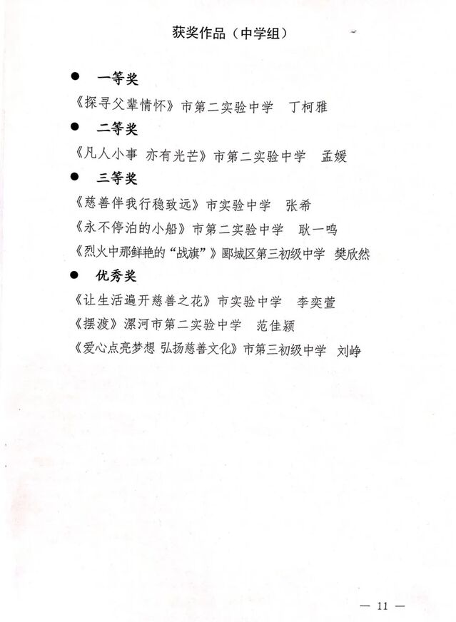 会上,小学组优秀作品省级参评一等奖获得者漯河小学胡嘉宝、中学组一等奖获奖者市第二实验中学孟媛、丁珂雅分别发表了获奖感言,他(她)们分享了获奖的喜悦、结缘慈善的美好和对全市中小学生心存善念、多行好事的期许......