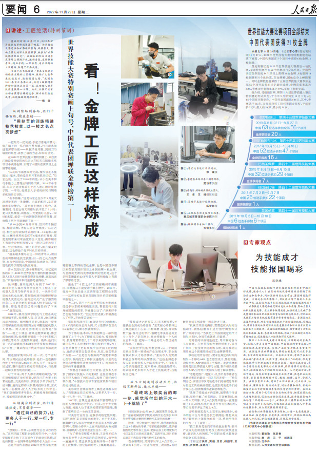 奥地利时间11月27日,2022年世界技能大赛特别赛落下帷幕。世界技能大赛是当今世界地位最高、规模最大、影响力最大的职业技能赛事,被誉为“世界技能奥林匹克”。我国派出的36名选手在赛场上挥洒汗水,激扬青春,发扬执着专注、精益求精、一丝不苟、追求卓越的工匠精神,取得了优异成绩。