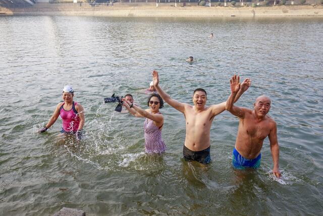漯河市冬泳协会的冬泳爱好者们冒着严寒,