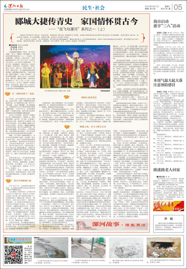2月2日下午,记者到原市群艺馆馆长李伯良家采访。李伯良今年83岁,对岳飞研究颇深。他在1980年创作了戏剧《还我河山》,由郾城剧团多次演出,收到良好的社会效果。记者采访时,他刚完成戏剧《郾城之战》的剧本创作。谈到岳飞在漯河的故事,李伯良表示,郾城大战只是对当时发生在郾城附近的战役的总体说法,时间不仅仅是发生郾城大战那一天,区域也不仅仅只发生在郾城县城附近,还有后来发生的临颍之战和颍昌府大战。他对《宋史·岳飞传》记述的七月初八日之战特别熟悉,这也是他进行文艺创作的核心依据。他告诉记者:“郾城大捷之所以能以少胜多名垂青史,我觉得主要有两个原因,一是岳飞的战术得当,大破‘拐子马’‘铁浮屠’;二是岳家军纪律严明,‘冻死不拆屋,饿死不掳掠’,深受群众爱戴拥护。”他还举例说,挂刀营村村名的来历就是因为岳飞在那里驻军,为严明军纪,在村口的大树上挂了一把大刀,违反军纪者斩。