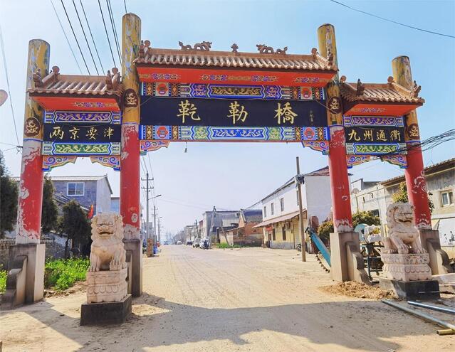 近日,记者到䩐勒桥村采访时看到,该村有一座古风跨街牌楼立于村北口。牌楼正面脚下,有两只威风凛凛的石狮。牌楼上方写有“䩐勒桥”三个金色大字,两侧写有“两京要津”“九州通衢”八个字。