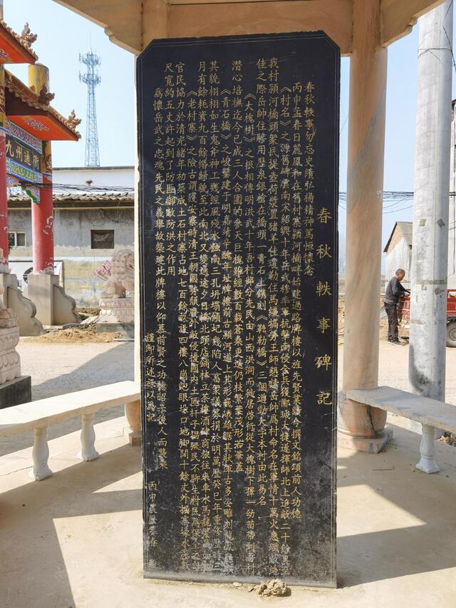 “现在村南颍河上的桥我们都叫新桥。在新桥西边上游580米处,还有一座老桥。”张明亮称,老桥边上本来也有一通石碑。记者了解到,该碑是镶金边的龙凤呈祥碑,碑上方刻有“岳武穆命名䩐勒桥”,碑文为《䩐勒桥春秋碑志》。2019年下半年修颍河时,这座石碑被翻斗车推断了。张明亮曾用石头胶把断碑粘住,但只撑了一年多,如今已不见踪影。