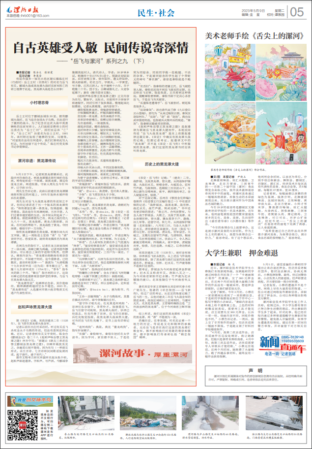 记者以前在吕庄村采访时,听过有关岳飞杀死金太子乌鸦的传说,但没有查到史料记载。近日,记者查到有关文字资料。陈金台《郾城县记》卷二十八《赵和声咏岳鄂王黑龙潭之捷》序言中写:“原题云《朗夫三弟述岳鄂王郾城县黑龙潭之捷》,旧碑所载犹及见之,余遍觅石刻不能得,因为长句(一种韵文形式,由五言诗、七言诗和民间歌谣发展而成,起于唐代,盛于宋代)。”