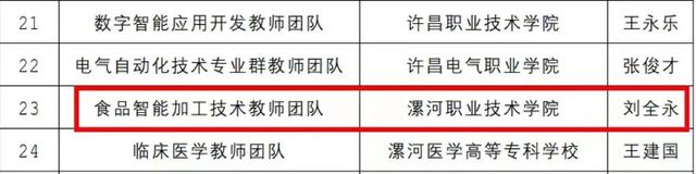 近日,河南省教育厅公布了《关于公布第三批高等职业学校“河南省高校黄大年式教师团队”名单的通知》(教职成〔2023〕248 号),漯河职业技术学院院长刘全永教授领衔的食品智能加工技术教师团队入选第三批高等职业学校“河南省高校黄大年式教师团队”。