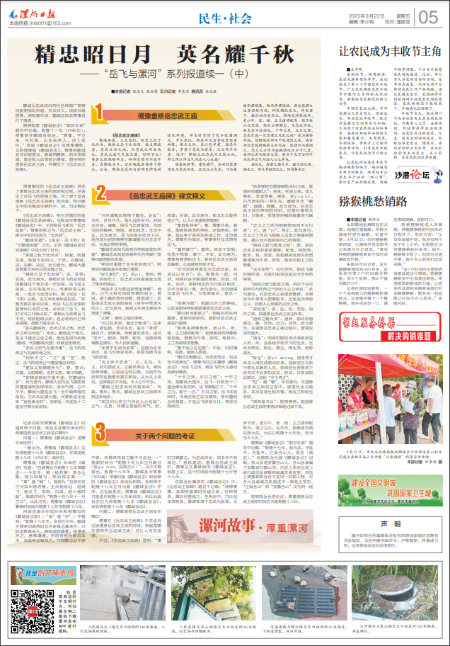 《岳忠武王庙碑》:明王诰撰写的是《郾城县岳忠武庙碑》,也收录在傅豫版《郾城县志》中。王诰称岳飞庙为“岳忠武庙”;傅豫则称之为“岳忠武王庙”,碑文中有时也称为“忠武祠”。
