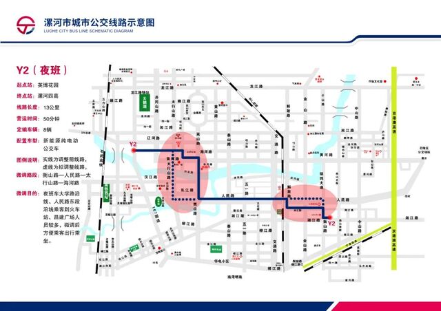 调整路段:海河路太行山路口——太行山路——大学路——漯河大学——人民路——人民医院——衡山路——英博花园。