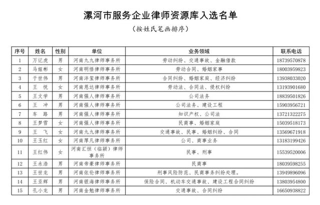 为全面贯彻落实党的二十大精神,充分发挥律师行业法律服务专业优势,更好服务实体经济发展,漯河市司法局、市律师协会结合漯河律师行业实际,建立漯河市服务企业律师资源库,现将《漯河市服务企业律师资源库入选名单》予以公布,供有关部门和企业在选聘律师时参考。