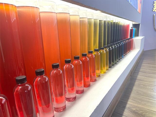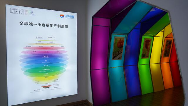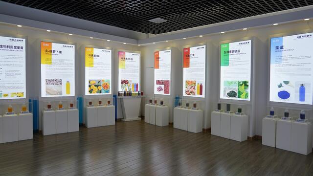 踏入中大恒源公司展厅,首先映入眼帘的是绚烂多彩的七色走廊。走廊两侧,各种色彩斑斓的天然色素原料及成品错落有致地陈列着,五彩斑斓的糖果、糕点、饮料,以及用纯植物色素印染的衣物与丝巾让人目不暇接。
