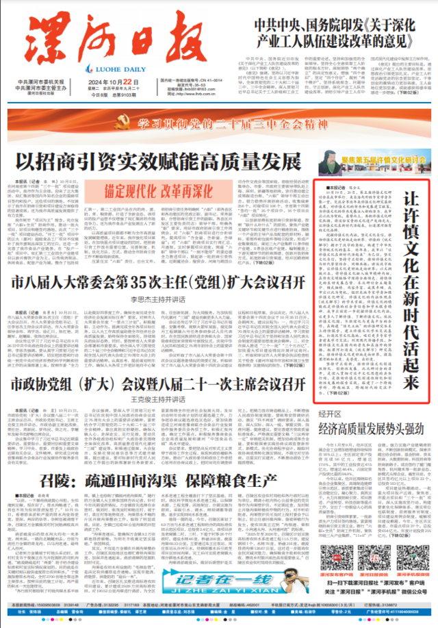 10月19日、20日,第五届许慎文化研讨会在我市举行。来自海内外的专家学者齐聚一堂,交流分享近年来许慎文化研究最新成果,对许慎文化的传承和发展建言献策,为许慎文化的传承发展注入新的活力。我市应以此为契机,乘势而上,再掀许慎文化研究热潮,将这份宝贵的文化遗产发扬光大,让许慎文化在新时代活起来,打造漯河独有的文化品牌。