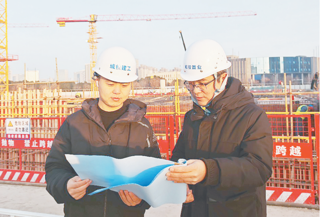 李淼(右)和谢雷杰(左)在澧水嘉园小区项目现场商讨工作 。尹晓玉 摄