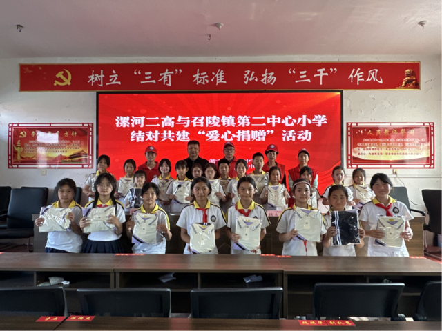 为充分发挥城区教育资源的辐射引领作用,提高农村教育教学质量、促进城乡教育均衡发展,在"六一"国际儿童节来临之际,漯河市第二高级中学于5月26日赴召陵镇第二中心小学开展结对共建“爱心捐赠”活动。漯河二高党委委员、副校长宋保安带领校团委书记周玉乾、团委委员潘焕杰,与市合唱协会秘书长王爱荣共同参与此次"乡村学校少年宫音乐课堂"捐赠仪式。