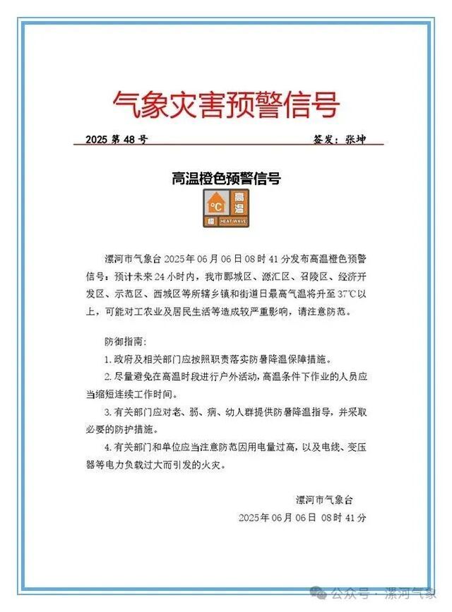 今天,漯河气象台再发高温橙色预警信号,中午前后最高气温高达39度。