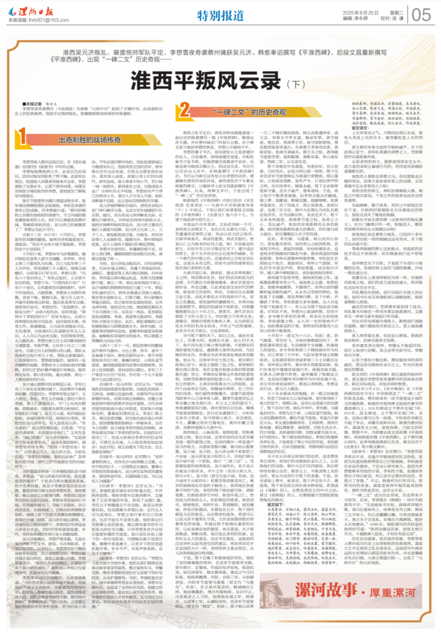 淮西吴元济叛乱,裴度统帅军队平定,李愬雪夜奇袭蔡州擒获吴元济。韩愈奉诏撰写《平淮西碑》,后段文昌重新撰写《平淮西碑》,出现“一碑二文”历史奇观——
