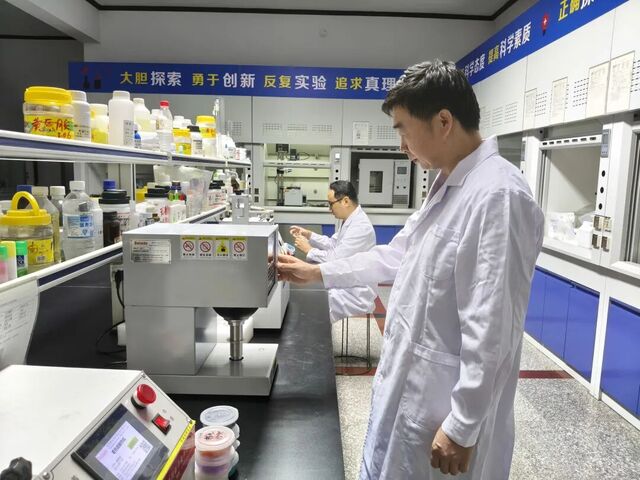 在罗弗公司实验室,“大胆探索、勇于创新、反复实验、追求真理”等标语格外醒目。技术人员认真操作精密仪器,对超轻黏土的耐温性及其包装的密封性进行检测。这里不仅是产品配方研制、开发及技术设备研制的核心阵地,还是罗弗公司的“最强大脑”。
