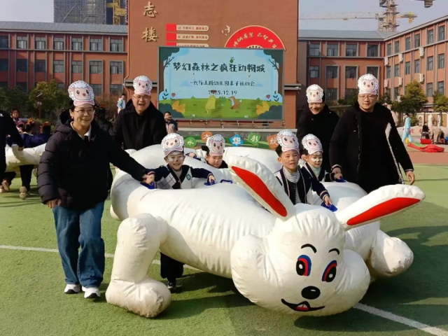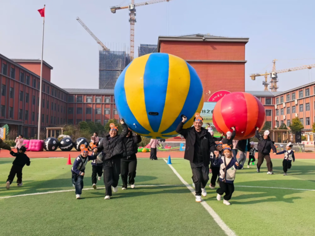 口令一响,欢乐闯关正式开场——“森林跳跳跳”里,家长和孩子面对面、手拉手,跟着节奏一起蹦,像一群快乐的小兔子;击掌问好环节,家长冲刺到孩子面前,一个击掌、一个拥抱,爱意瞬间满格;“大灰狼抓小动物”尖叫连连,宝贝攥紧爸爸妈妈的手左闪右躲,笑声盖过哨声。巨型道具把气氛推向高潮:“运转乾坤”的大气球在亲子合力下“咕噜”前进;“龟兔赛跑”踩着充气道具你追我赶,直接把寓言跑成现实;“爆笑毛毛虫”一拱一拱,全场笑到弯腰;“火力全开”“动物聚会”轮番上阵,大脚足球、卡通充气玩具让孩子们嗨到飞起。这一刻,家长只是“超级玩伴”,每一次并肩冲线,都是定格在手机里的温暖大片。