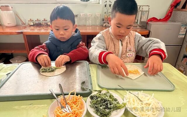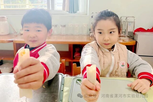 “咬春尝鲜”活动里,孩子们与老师一起认识了萝卜、春饼等春日食材。他们用小手轻轻卷起薄薄的春饼,放入清脆的萝卜条和嫩绿的蔬菜丝,再小心翼翼地咬上一口,脸上洋溢着发现美味的惊喜。孩子们在“咬春”的习俗体验中,不仅尝到了春天的第一口鲜,更在味蕾的触动下,懵懂地理解了迎新纳福的美好寓意。