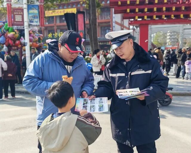 2月17日,大年初一,漯河市区神州鸟园、河上街景区周边道路人流量、车流量增加,漯河市公安局交通管理支队第二执勤大队民辅警坚守岗位,在全力疏导保通的同时,在河上街景区开展交通安全宣传活动。